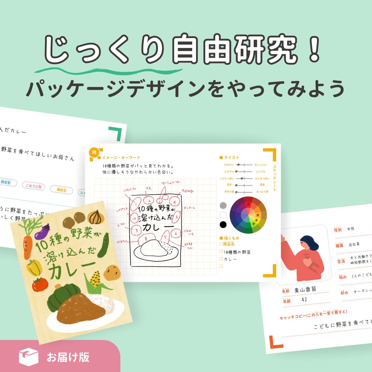このキットでは、実際に手を動かしながら、「思わず手に取りたくなるパッケージデザイン」をじっくり実践できます。